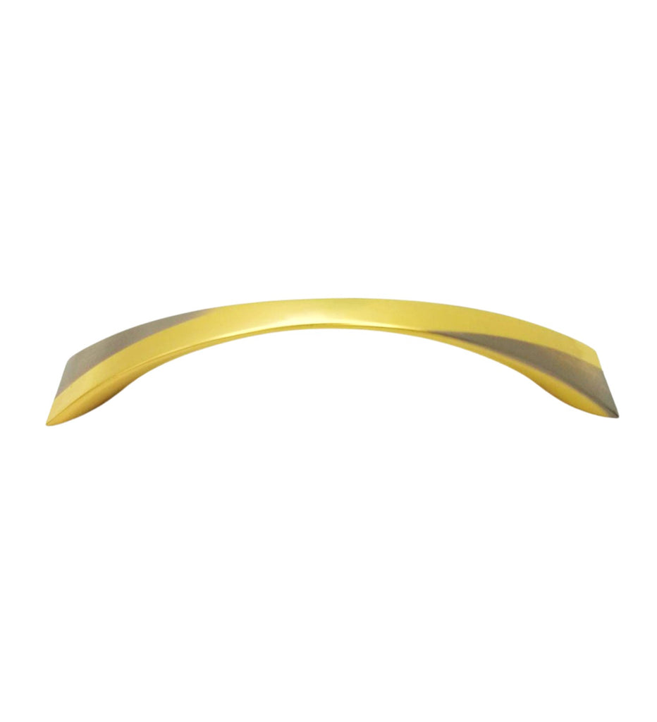 Jaladera para mueble con diseño distintivo de líneas curvas y separación precisa entre dos terminados de lujo: hélice en baño de oro y cuerpo en níquel satinado. Este doble acabado en un mismo plano refleja un proceso de fabricación complejo y meticuloso, logrando una pieza moderna y sofisticada.
