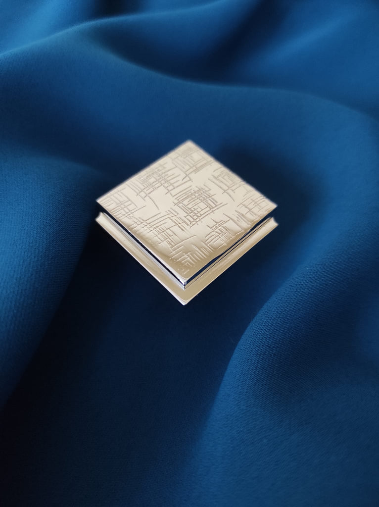 Pomo decorativo con forma cuadrada y pestaña en relieve, con un grabado de líneas cruzadas (crosshatch) que aporta textura y sofisticación.