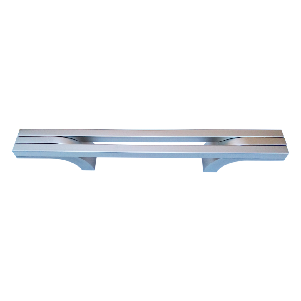Jaladera para mueble con un diseño actual compuesto por dos barras paralelas separadas por un espacio central, sostenidas por pies con una sutil media curva que aporta fluidez visual.